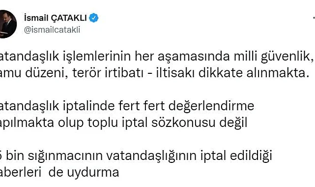 İçişleri Bakan Yardımcısı ve Bakanlık Sözcüsü İsmail Çataklı, ülkede yaşayan sığınmacıların vatandaşlıklarının toplu iptaline yönelik gündemde yer alan haberlerin gerçeği yansıtmadığını belirtti. Konuyla ilgili açıklama yayımlayan Çataklı, vatandaşlık iptalinin bireysel şekilde gerçekleştiğini belirterek şu ifadelere yer verdi: