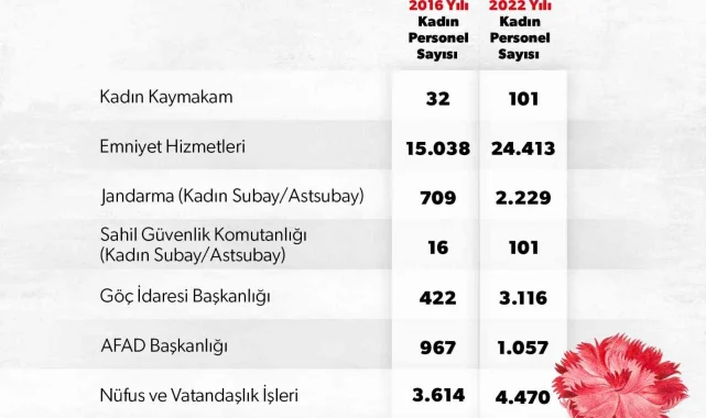 İçişleri Bakanlığı tarafından yapılan açıklamada, "Bakanlığımızdaki kadın personel sayısı günden güne artan bir grafik çiziyor. Geride kalan 5 yılda gerek kadın kaymakam oranında, gerekse Emniyet, Jandarma, Sahil Güvenlik, AFAD, Göç İdaresi ile Nüfus ve Vatandaşlık İşleri bünyesinde görev yapan kadın personel oranında önemli artışlar göze çarpıyor. Kadın kaymakam sayısı 2016 yılında 32 iken, 2022 yılında üç kat artışla 101'e çıktı. Benzer tablo Emniyet hizmetleri sınıfında da mevcut. Emniyet hizmetlerinde 2016 yılında toplam kadın personel sayısı 15 bin 38 iken, 2022 yılında 24 bin 413'e yükseldi. Aynı dönemde Jandarma Genel Komutanlığı bünyesindeki kadın subay/astsubay artışı yaklaşık 2,5 kat, Sahil Güvenlik Komutanlığı bünyesindeki kadın subay/astsubay artışı ise 6 kat oldu. 2016 yılından 2022 yılına Jandarma hizmetleri kadın subay/astsubay sayısı 709'dan 2 bin 229'a, Sahil Güvenlik hizmetleri kadın subay/astsubay sayısı 16'dan 101'e yükseldi. Göç İdaresi Başkanlığı bünyesinde 2016 yılında 422 kadın personel görev yaparken, 2022 yılında bu sayı 3116'ya yükseldi. 2016 yılında Göç Başkanlığı'nda yüzde 12 olan kadın personel oranı 2022'de yüzde 24'e yükseldi. AFAD Başkanlığı'nda 2016 yılında 967 kadın personel bulunmaktayken, 2022 yılında bu sayı 1057'ye yükseldi" denildi.