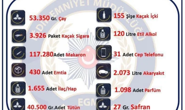 50 operasyon düzenlendi 70 şüpheliye işlem yapıldı. Yapılan operasyonlarda 53 bin 350 gram çay, 3 bin 926 paket kaçak sigara, 117 bin 280 adet makaron, 430 adet emtia, bin 655 adet ilaç hap, 40 bin 500 gram adet tütün, 155 şişe kaçak içki, 120 litre etil alkol, 31 adet cep telefonu, 2 bin 73 litre akaryakıt, bin 98 adet parfüm, 27 gram safran ele geçirildi" denildi.