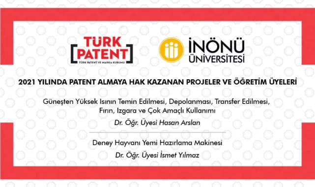 İnönü Üniversitesi Eczacılık Fakültesi öğretim üyesi Dr. Öğr. Üyesi İsmet Yılmaz ve öğretim üyesi Dr. Öğr. Üyesi Hasan Arslan'ın yaptıkları bilimsel araştırma projelerine 2021 yılı içerisinde Türk Patent ve Marka Kurumu tarafından Patent Belgesi verildi.