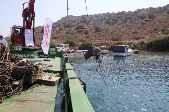 Muğla İl Tarım ve Orman Müdürlüğü’nün Su Ürünleri Şube Müdürlüğü bünyesinde oluşturduğu 12 kişilik dalış ekibi, bugün Gümüşlük’te deniz dibi temizliği yaptı. Gün boyu Gümüşlük açıklarında tonoz ve hayalet ağ dalışı yapan ekip, Eski Myndos Kenti kalıntıları ile iç içe yaşayan Gümüşlük’ün Filibit Koyundan 8 tonoz, 13 çapa, zincir ve halattan oluşan toplam 20 ton atık çıkardı. Çalışmaya, Bodrum Sahil Güvenlik Komutanlığı ile Bodrum Liman Başkanlığı da destek verdi. Denizden çıkarılan tonoz ve atıklar, atık alım için bölgeye getirilen bir teknenin güvertesinde toplanarak sergilendi.