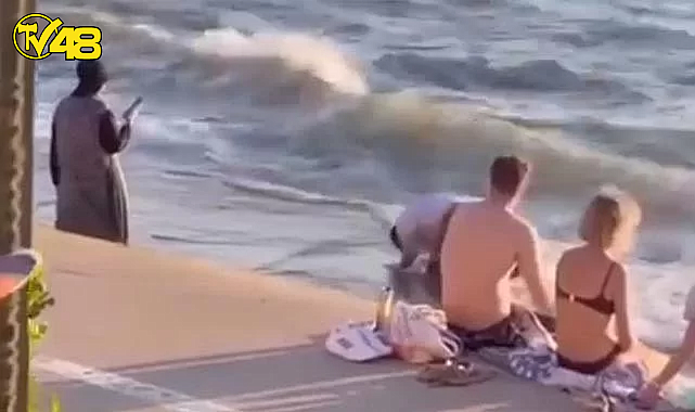 Dikkat çeken görüntülerde bir kişi, yanındakilere ve denizin dalgalarına aldırış etmeden namaza duruyor. Çevredekilerin şaşkın bakışları arasında secdeye giden kişinin başka vatandaşlar tarafından videoya alındığı görüldü.