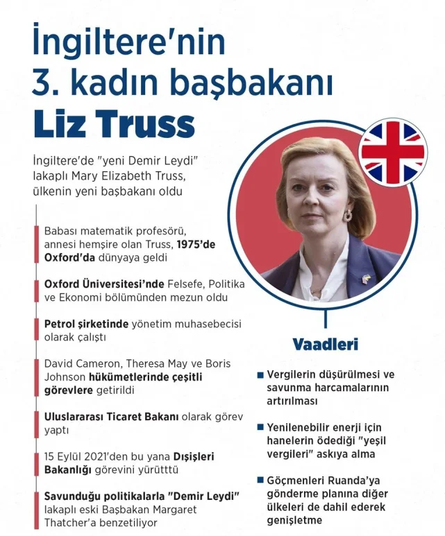 47 yaşındaki Liz Truss, İngiltere tarihinin 3'üncü kadın başbakanı olurken, 2015 seçimlerinden bu yana Muhafazakar Parti'den seçilen dördüncü başbakan oldu.