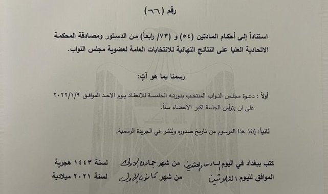 Irak Cumhurbaşkanı Berham Salih, Irak Federal Mahkemesi'nin 10 Ekim'deki Meclis seçimlerinin sonuçlarını onaylamasının ardından imzaladığı kararname ile Meclise 9 Ocak'ta toplanma talimatı verdi. Kararnameyi Twitter hesabından yayınlayan Cumhurbaşkanı Salih, ülkenin çıkarlarını ve Iraklıları korumak, Iraklılara hizmet etmek ve egemenliğini geliştirmek için etkili bir hükümet" kurulmasını umduğunu ifade etti.