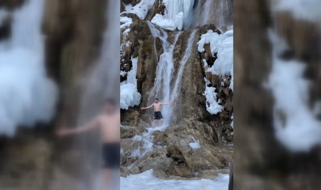 Erzincan'da doğa sevdalısı Selim Özgün, İskandinav kültürüne özenerek buz gibi akan Girlevik Şelalesi'nin altına girdi.