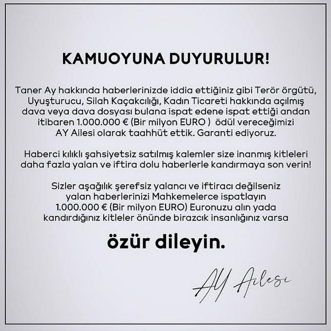 Öte yandan Ay ailesi, Taner Ay'ın hakkında çıkan haberler ile ilgili bir paylaşımda bulunarak ispat etmeye çağırdı ve 1 milyon euro ile ödüllendireceklerini duyurdu.