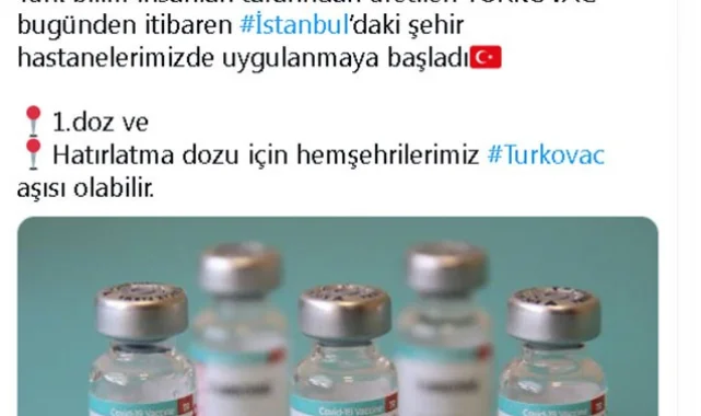 İstanbul Valisi Ali Yerlikaya sosyal medya hesabı üzerinden yaptığı paylaşımda, "Artık Covid19'a karşı çok daha güçlüyüz. Türk bilim insanları tarafından üretilen TURKOVAC bugünden itibaren İstanbul'daki şehir hastanelerimizde uygulanmaya başladı. 1.doz ve dozu için hemşehrilerimiz Turkovac aşısı olabilir" ifadeleri kullandı.