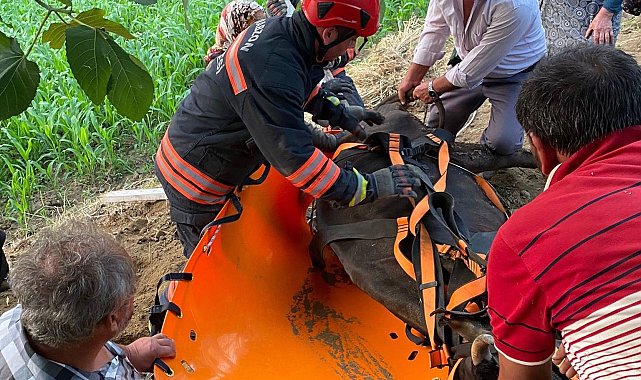 Trabzon'un Akçaabat ilçesinde dik yamaçtan yaklaşık 10 metre yuvarlanan inek itfaiye ekiplerince kurtarıldı.