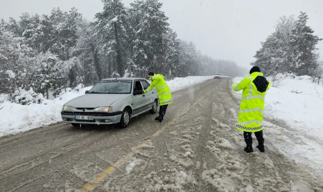 Samsun Alaçam İlçe Jandarma Komutanlığı trafik ekipleri yoğun kar yağışı nedeniyle Kızlan grup yolunda zincirsiz araçlara geçit vermedi.