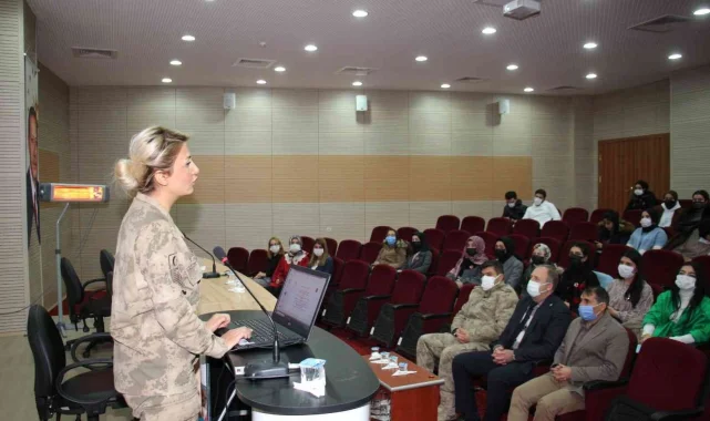 Erzurum İl Jandarma personelinden Jandarma Astsubay Üst Çavuş KADES uzmanı Tuğba Güven, Jandarma Astsubay Kıdemli Çavuş Ayşe Ağdağ ve Uzman Jandarma Kıdemli Çavuş Hamit Kılıç, Oltu Beşeri ve Sosyal Bilimler Fakültesi öğrencilerine bilgi verildiler.