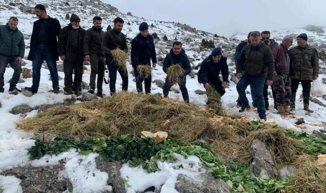 Kahramanmaraş'ta jandarma ekipleri karlı dağa yaban hayvanları için yem bıraktı.