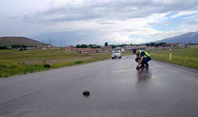 Erzincan merkeze bağlı Günebakan Mahallesi güzergâhında yola çıkan kaplumbağalar, o esnada seyir halinde olan jandarma trafik ekibinin dikkatini çekti.
