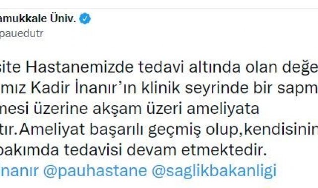 Muğla'nın Ortaca ilçesinde rahatsızlanan Kadir İnanır, Pamukkale Üniversitesi Tıp Fakültesi Hastanesine sevk edilmişti. Hastanenin yoğun bakımında kontrol altına alınan İnanır'ın beyin damarında pıhtı atması sonucu rahatsızlandığı kaydedilmişti. Dün ise Pamukkale Üniversitesi Rektörü Ahmet Kutluhan, İnanır'ın sağlık durumunun iyi olduğunu ve felç riskinin olmadığını açıklamıştı. Kadir İnanır'ın klinik seyrinde sapma gözlenmesi üzerine ameliyat olduğu öğrenildi. Konu hakkında sosyal medyada açıklama yayımlayan Pamukkale Üniversitesi Hastanesi, "Üniversite Hastanemizde tedavi altında olan değerli sanatçımız Kadir İnanır'ın klinik seyrinde bir sapma gözlenmesi üzerine akşam üzeri ameliyata alınmıştır. Ameliyat başarılı geçmiş olup, kendisinin yoğun bakımda tedavisi devam etmektedir" ifadelerine yer verildi.