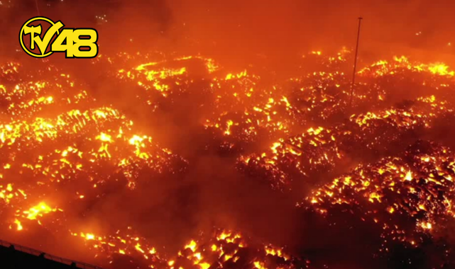 Aydın'ın Söke ilçesinde 12 Temmuz'da bir kağıt fabrikasında çıkan yangın, karadan ve havadan müdahaleyle söndürülmeye çalışılıyor. Çevre il ve ilçelerdeki itfaiye ve orman ekiplerinin de sevk edildiği yangın, fabrikanın ikinci bölümüne de sıçradı.