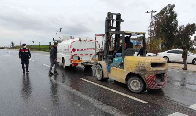 Antalya'nın Manavgat ilçesi D-400 Karayolu Gültepe Kavşağında kırmızı ışıkta bekleyen kamyona, yakıt tankerinin arkadan çarpması sonucu meydana gelen kazada şans eseri yaralanan olmadı. Yağmurlu havada fren yapmasına rağmen duramayarak kırmızı ışıkta bekleyen kamyona arkadan çarpan yakıt tankeri, forklift ile itilerek yol kenarına alındı.