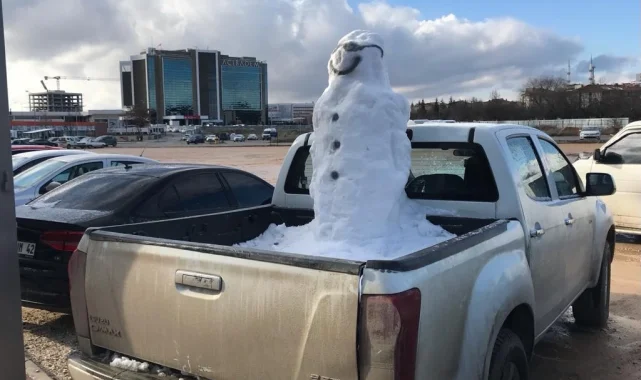 Eskişehir'de park halindeki kamyonetin kasasına yapılan gülümseyen kardan adam görenleri şaşırttı.