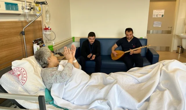 Eskişehir Şehir Hastanesi'nde kanser tedavisi gören Nurhan Altuk, Üroloji Uzmanı Doç. Dr. Coşkun Kaya'nın çaldığı bağlama ve müzik öğretmeni olan oğlu Oğuzhan Mert'in söylediği şarkılarda moral buluyor.
