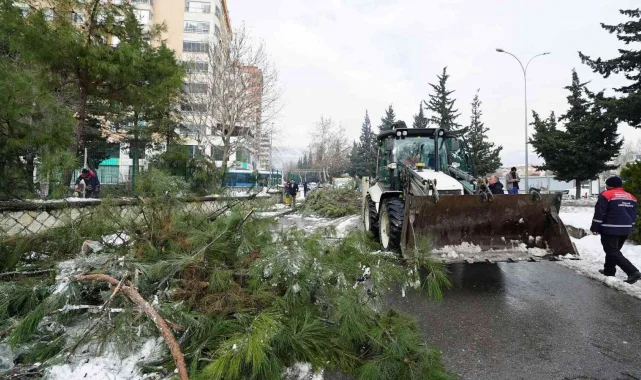 Kahramanmaraş'ta şehir genelinde bir yandan tuzlama ve yol açma çalışmaları gerçekleştiren Büyükşehir Belediyesi ekipleri, öte yandan yoğun yağışlar nedeniyle yola savrulan nesnelerin kaldırılması ve yaya yollarının açılması için seferber oldu.