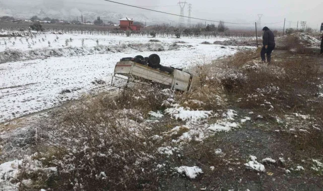 Manisa'nın Alaşehir ilçesinde kar yağışı sebebiyle kayganlaşan yolda sürücüsünün direksiyon hakimiyetini kaybettiği kamyonet şarampole devrildi. Kazada 2 kişi yaralandı.