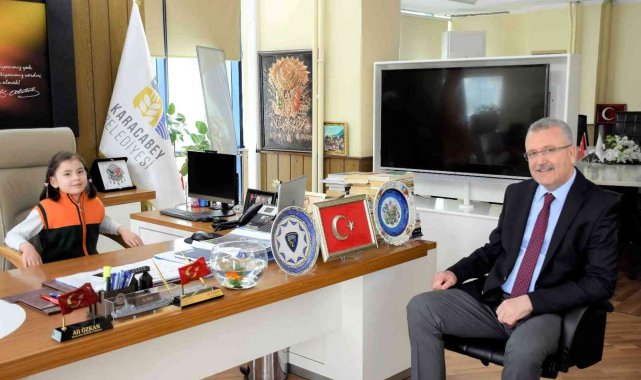 Karacabey Belediye Başkanı Ali Özkan, 23 Nisan Ulusal Egemenlik ve Çocuk Bayramı çerçevesinde minik öğrencileri ağırlarken, başkanlık koltuğunu da Ömer Matlı İlkokulu 3. sınıf öğrencisi Cemre Demirdağ'a bıraktı.