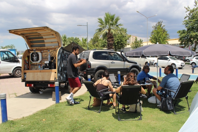 Aslan ve Urjav, yaz boyunca İzmir'den Antalya'ya karavanları ile giderek hem para kazanacak hem de tatil yapacak. "Karavanımızı kendimiz yaptık" Ercan Urjav, "Yaz sezonunda Çeşme Alaçatı'da baristalık yapıyorduk. Volkan'la da orada tanıştık. İkimiz de kahve içmeyi çok seviyoruz. Karavanla kahve işi yapmayı planladık. Hem gezip hem de harçlığımızı çıkarmayı düşündük. Ortaklığımız bu şekilde başladı. Ufak bir birikimimiz vardı. Karavanımızı kendimiz yaptık. İzmir'den başlayıp Antalya'ya, Mersin'e kadar karavanımızla gidip hem gezeceğiz hem de para kazanacağız. Biz özgür insanlarız. Tek bir yerde sabit kalmayı sevmiyoruz. Hem tatil yapacağız hem de harçlığımızı çıkaracağız" dedi. "Vegan ve sağlıklı ürünler satıyoruz" Alef Volkan Aslan ise, "Uzun süredir bu sektördeyiz. Markamızı kurduktan sonra farklı bir konseptle çalışmak istedik. Yurt dışında karavanda kahve konsepti aslında çok popüler. Biz de bu konsepti ülkemizde hayata geçirmeye karar verdik. Ürünlerimiz vegan ürünler. Hepsi sağlıklı. Yüksek kalorili ürünler kullanmıyoruz. İşleri büyütüp şubeleşmeyi düşünüyoruz. Bu günlerde Karşıyaka sahilindeyiz. Rotamız Çeşme, Bodrum, Marmaris, Fethiye, Antalya, Mersin olacak" diye konuştu.