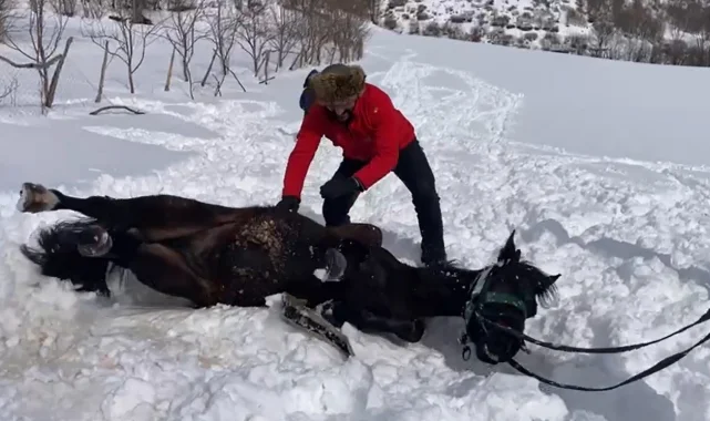 Tokat'ta ahırdan çıkartıldığında kara yatarak yuvarlanan 'karayel' isimli atın kar sevinci objektiflere yansıdı.