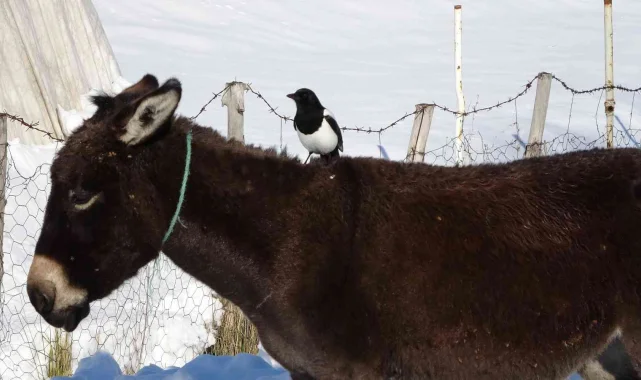 Muş'ta etkili olan yoğun kar yağışı nedeniyle doğada yem bulmakta güçlük çeken saksağanın köydeki eşeklerin başına bela olması, ortaya gülümseten görüntüler çıkardı.