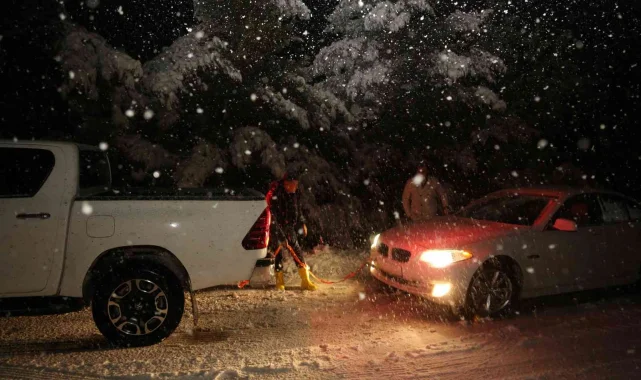 Karda mahsur kalan araçlar belediye ekiplerince kurtarıldı