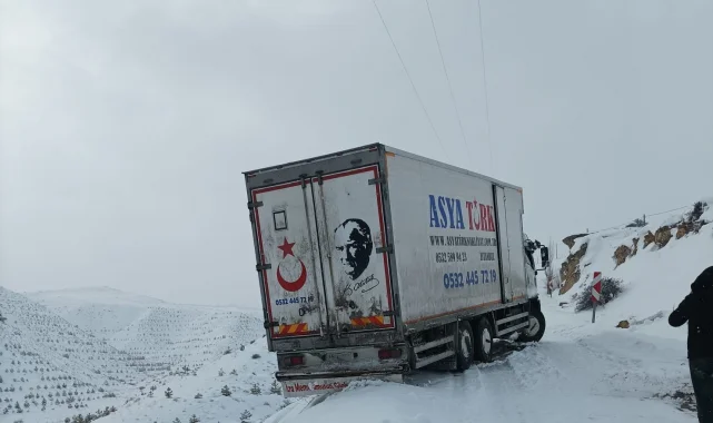 Malatya'nın Darende ilçesinde buzlanan yolda kayan bir nakliyat aracı yolu trafiğe kapattı.