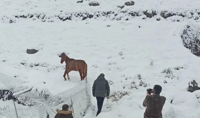 Yoğun kar altında donmak üzere olan at, bulunduğu yerden alan ekipler, barınağa götürerek tedavi altına aldı.