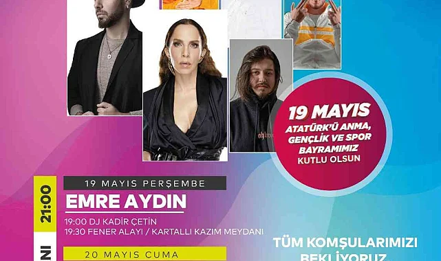 Kartal Belediyesi'nin düzenlediği kutlamalar çerçevesinde Emre Aydın, Sertab Erener ile rap dünyasının sevilen isimleri Batuflex, Velet, Ati242 ve Mert Şenel şarkılarıyla Kartal Meydanı'nda bir dizi konsere imza atacak. Dj Kadir Çetin'in sahne performanslarının da yer alacağı kutlamalar çerçevesinde Kartallılar 19 Mayıs heyecanını üç gün üç gece yaşayacak. 19 Mayıs Perşembe akşamı saat 21.00'de Emre Aydın sahne alırken, 20 Mayıs Cuma akşamı saat 21.00'de Sertab Erener Kartallılar ile buluşacak. 21 Mayıs Cumartesi gecesi ise rap sanatçıları, Kartallı hayranlarına sevilen şarkılarını seslendirecek.