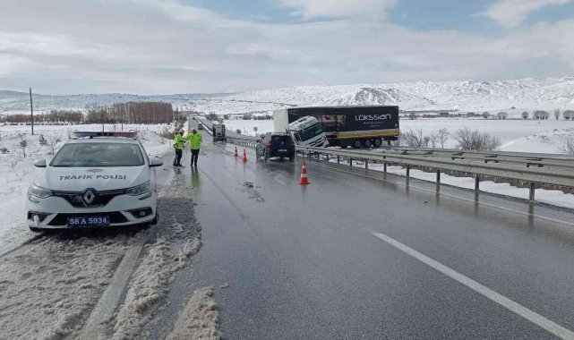 Sivas'ta yağan kar sonrası yolun kaygan oluşu nedeniyle kayan tır, karayolunu tek taraflı olarak araç ulaşımına kapattı.
