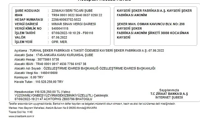 Kayseri Şeker tarafından, Turhal Şeker Fabrikası'nın son ödeme taksiti ile ilgili açıklama yapılarak, son taksit ödemesine dair banka dekontu paylaşıldı.