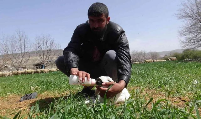 Hayvancılıkla uğraşan yabancı uyruklu Raşid El Ceruh'un (26), koyunlarından bir tanesi ön 2 ayağı olmayan kuzu dünyaya getirdi. Koyunun doğumuna yardımcı olan, Raşid El Ceruh, kuzuyu biberonla besliyor.