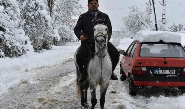 Bartın'da 4 gün boyunca etkili olan kar yağışı sonrası iş adamı Fahri Gürbüz, ulaşımını at ile sağlıyor.