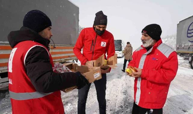 Türkiye'nin pek çok şehrinde başlayan ve birkaç gündür etkisini sürdüren yoğun kar yağışı sebebiyle şehirlerarası yollarda mahsur kalan ve bulundukları yerlerden saatlerce hareket edemeyen vatandaşlara Kızılay ekipleri gıda ve sıcak içecek yardımında bulundu.