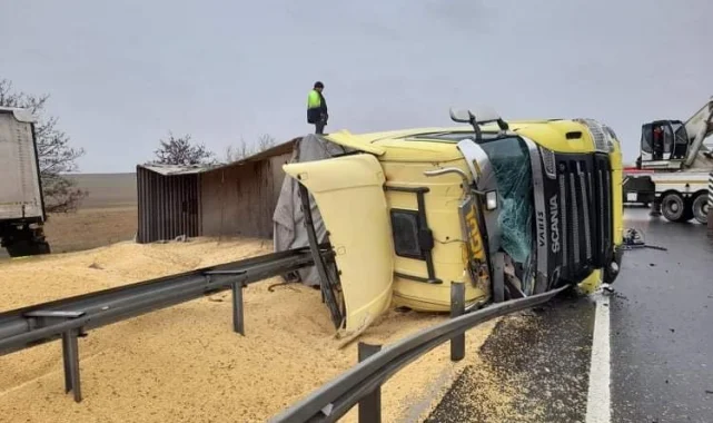 Konya'nın Kulu ilçesinde yağış sonrası kayganlaşan yolda kontrolden çıkan yeşil mercimek yüklü tır, bariyerlere çarptıktan sonra refüje devrildi. Kazada sürücü hafif yaralanırken, mercimekler yola saçıldı.