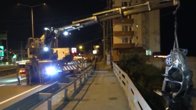 Kontrolden çıkan otomobilin 50 metre yükseklikten şarampole uçtuğu kaza anı, bir iş yerinin güvenlik kamerasına yansıdı. Görüntülerde; sürücüsünün kontrolünü yitirdiği otomobilin çöp konteynerine çarptıktan sonra 50 metrelik şarampole uçtuğu yer aldı.