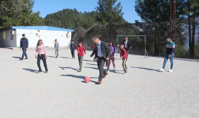 Bucak Kaymakamı Erol Tanrıkulu, ziyaret ettiği Karacaören Ortaokulu'nda çocuklarla futbol maçı yaptı.