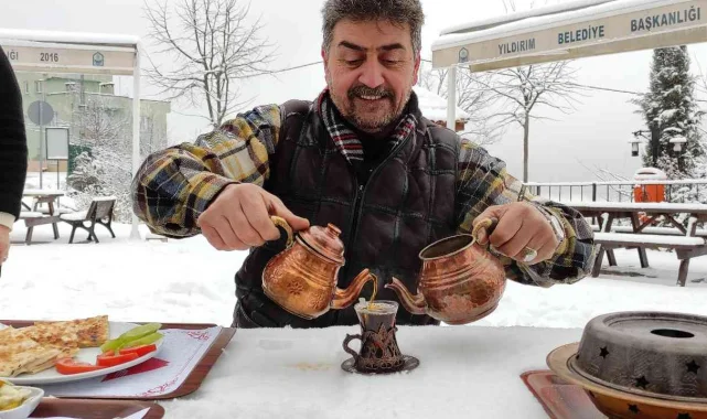Bursa'da Uludağ eteklerinde bulunan köyde, karlı günlerde müşteriler, kahvaltılarını karların üzerinde yapıp keyifli zaman geçiriyor.