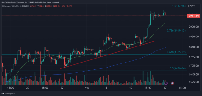 Shapella güncellemesi öncesi 1900$ bölgesinde fiyatlanan Ethereum, güncellemenin ardından 2150$’a ulaşarak hızlı bir yükseliş yaşadı. Böylece geçtiğimiz haftayı %13’e varan bir yükselişle kapattı ve son dönemde Bitcoin ile arasında açılan farkı kapatmış oldu. Ek olarak Bitcoin dominasyonunun bir miktar geri çekilmesi Ethereum’u desteklemeye devam etti. Şu sıralar 2090$ seviyelerinden alıcı bulan Ethereum için 11 ayın en yüksek seviyesi olan 2150$ seviyelerinin tekrar test edilmesi ve aşılması yükseliş hareketinin devamı için kritik önemde. Ancak şu anda Bitcoin ile birlikte alıcı-satıcı dengesinin oluştuğu ve konsolide olan bir Ethereum fiyat hareketi göze çarpıyor. Yukarıda 2150$ önemli ve ilk direnç seviyesi olmaya devam ederken aşağıda sırasıyla 2050$ ve 2000$ destek seviyeleri olarak karşımıza çıkıyor.