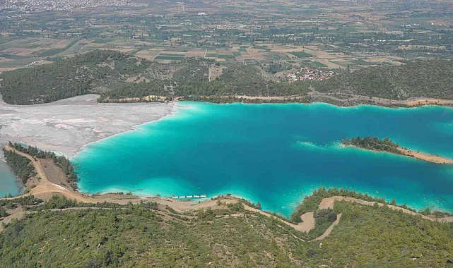 Muğla'nın Yatağan ilçesinde bulunan termik santralde kullanılan kömür atıklarından oluşan kül dağının kıyısındaki gölet, mavi ve turkuaz rengi nedeniyle...