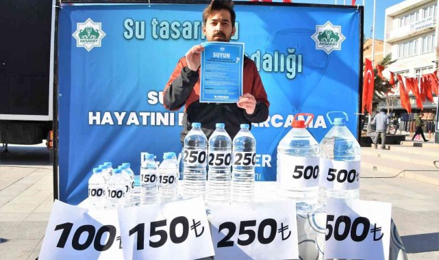 Son yıllarda yaşanan kuraklıkla birlikte barajlardaki su seviyesinin düşmesi sonucu Aksaray Belediyesi farkındalık oluşturmak için meydanda açtığı tezgahta 5 litrelik suyu 500 TL'den satışa sundu. Su şişelerinin üzerindeki fiyatlara gören vatandaşlar şaşkınlıkla ne olduğunu anlamaya çalışırken, kimi vatandaşlarda farkındalığa destek olmak için 0,33 ml suyu 100 TL'ye satın aldı.