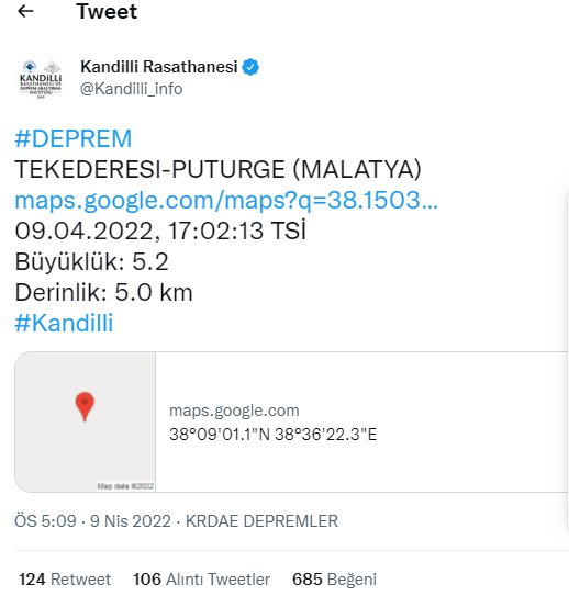 Merkez üssü Tekederesi- pütürge olarak belirlenen 5.2 büyüklüğünde deprem meydana geldi.