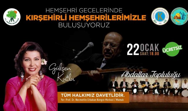 Prof. Dr. Necmettin Erbakan Kongre Merkezi'nde 22 Ocak tarihinde Saat: 18.00'da gerçekleşecek olan 'Hemşehri Geceleri'nde sahne alacak Türk halk müziği sanatçısı Gülşen Kutlu ve Abdallar Topluluğu, şehrin manevi ve kültürel değerlerini yansıtan ezgileriyle dinleyicilere müzik ziyafeti yaşatacak. Tamamen ücretsiz olan kültür cümbüşü konser Mamak Belediyesinin sosyal medya hesaplarından da canlı olarak verilecek.