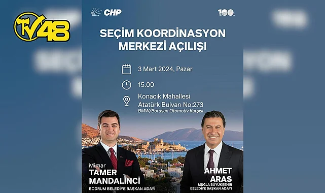 3 Mart 2024 Pazar günü saat 15.00’de Bodrum Belediye Başkan Adayı Tamer Mandalinci’nin ‘Bodrum Seçim Koordinasyon Merkezi’nin açılışını TV48 olarak canlı yayınlıyoruz.