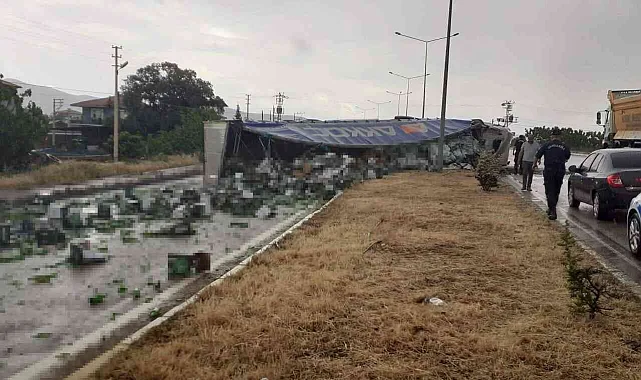 Manisa'da tır devrildi, alkol yüklü kutular yola saçıldı