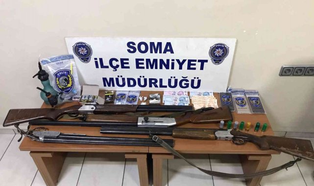 Manisa İl Emniyet Müdürlüğü Narkotik Suçlarla Mücadele Şube Müdürlüğü ve Soma İlçe Emniyet Müdürlüğü görevlilerince uyuşturucu veya uyarıcı madde ticareti yapan, nakleden ve kullanan şahıslara yönelik yapılan çalışmalar kapsamında, Soma ilçesinde 15 şahsa ait 15 ikamet adresinde sabah saat 07.00'da eş zamanlı olarak yapılan aramalarda, 8,88 gram metamfetamin maddesi, 4,5 gram esrar maddesi, 4 adet ruhsatsız tüfek, 20 adet kartuş, 5 adet uyuşturucu madde kullanmaya yarayan aparat, 2 adet çalıntı motosiklet, 900 TL uyuşturucu madde ticaretinden elde edildiği değerlendirilen para ele geçirildi. Konuyla ilgili gözaltına alınan 15 şüpheli şahıs hakkında adli işlemlere başlandığı bildirildi.
