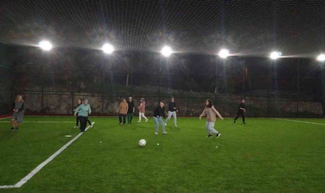 Manisa'nın Selendi ilçesinde Gençlik ve Spor Bakanlığı tarafından yaptırılan halı sahaya koşan kadınlar futbol gösterisi sundu.