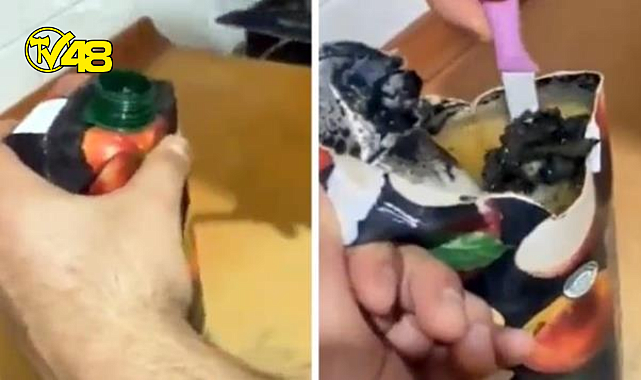 Bir vatandaş zincir marketten aldığı ünlü bir marka olan meyve suyunu çalkalayınca içerisinde bir gariplik olduğunu fark etti. Bunun üzerine eline bıçağı alıp kutuyu kesen vatandaş, beklemediği bir manzarayla karşılaştı.